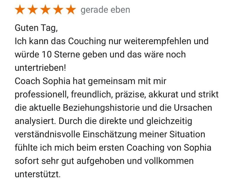 Mit 7 Jahren Erfahrung, fundierter psychologischer Ausbildung und zahlreichen Weiterbildungen habe ich bereits über 300 zufriedene Klienten aus Beziehungschaos und Liebeskummer zurück in ihre Lebensfreude begleitet.